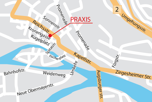 Die Praxis liegt im Zentrum, verschiedene Parkhäuser sind in der nahen Umgebung vorhanden.